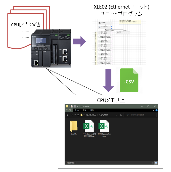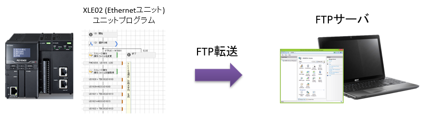 下記の構成で①と同様にEthernetユニットのユニットプログラムを用いることでCPUに負荷をかけることなく、FTPサーバにCSVファイルを転送する事ができました。