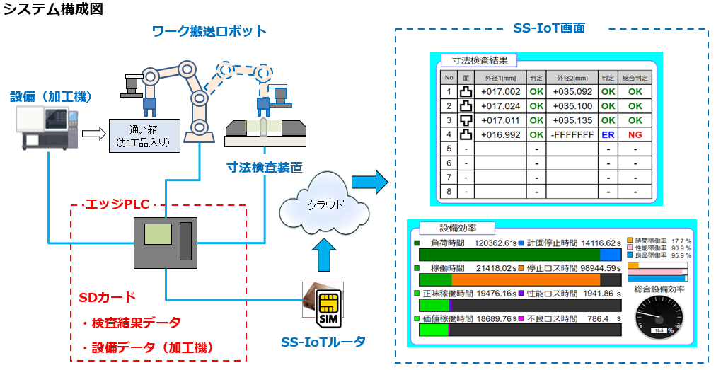- ・検査結果データと設備データをPLCのSDカードにCSV形式で保存する事を前提にSS-IoTで検査結果画面と設備効率の見える化を