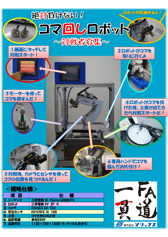 こま回しロボット(2013)ロボットハンド部には、こまを把持するチャックと認識するカメラと距離を測定するセンサーを備え、ロボットはこま置き台よりこまを把持し、回転台にて高速で回し、土俵に置きます。その後、土俵は手前に移動し、対戦相手(人)がこまを回して対戦します。