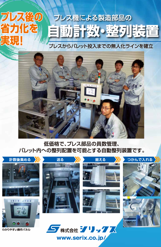 順送プレス品自動計算・整列搬送装置四日市市研究開発支援事業の補助金を受けプレス製造部品の計数管理とパレットへの整列配置を可能とする廉価でシンプルな自動整列搬送装置を開発しました。 |